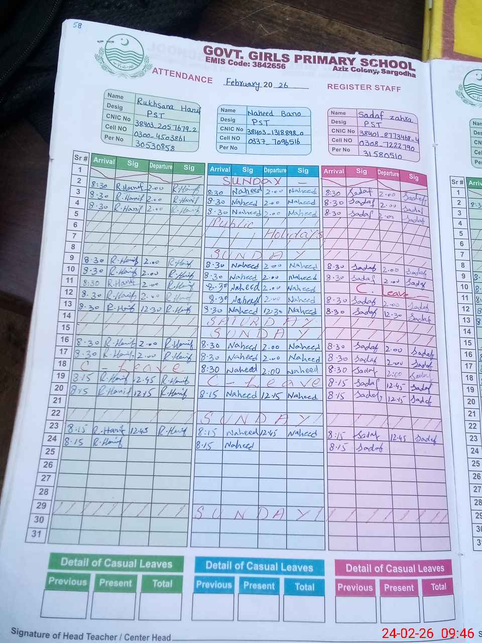 | CNIC | Full Name | Designation | R/C | Absence During Last Calender Month |