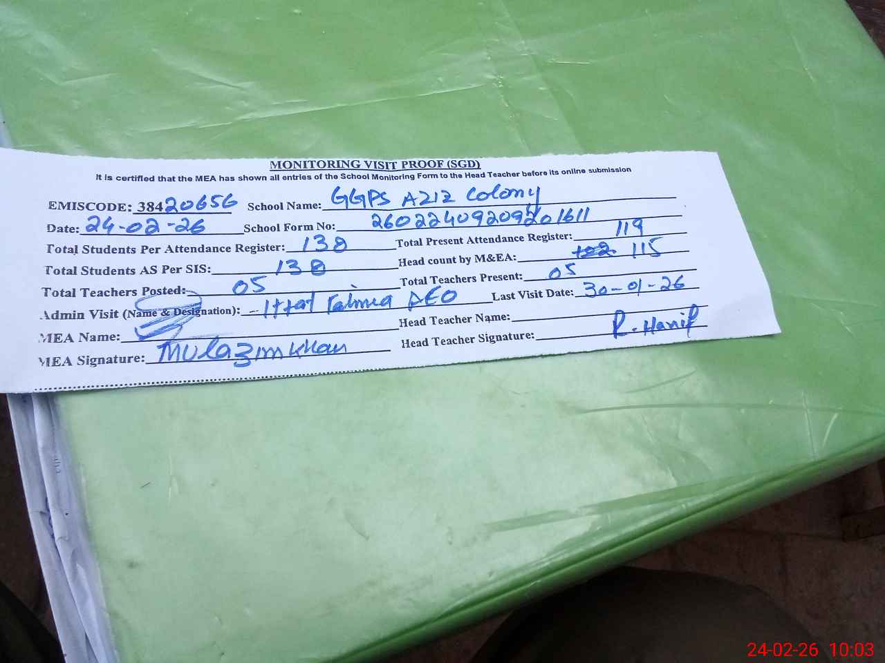 | Attendance Register | Head Teacher | MEA with School | Visit Proof |