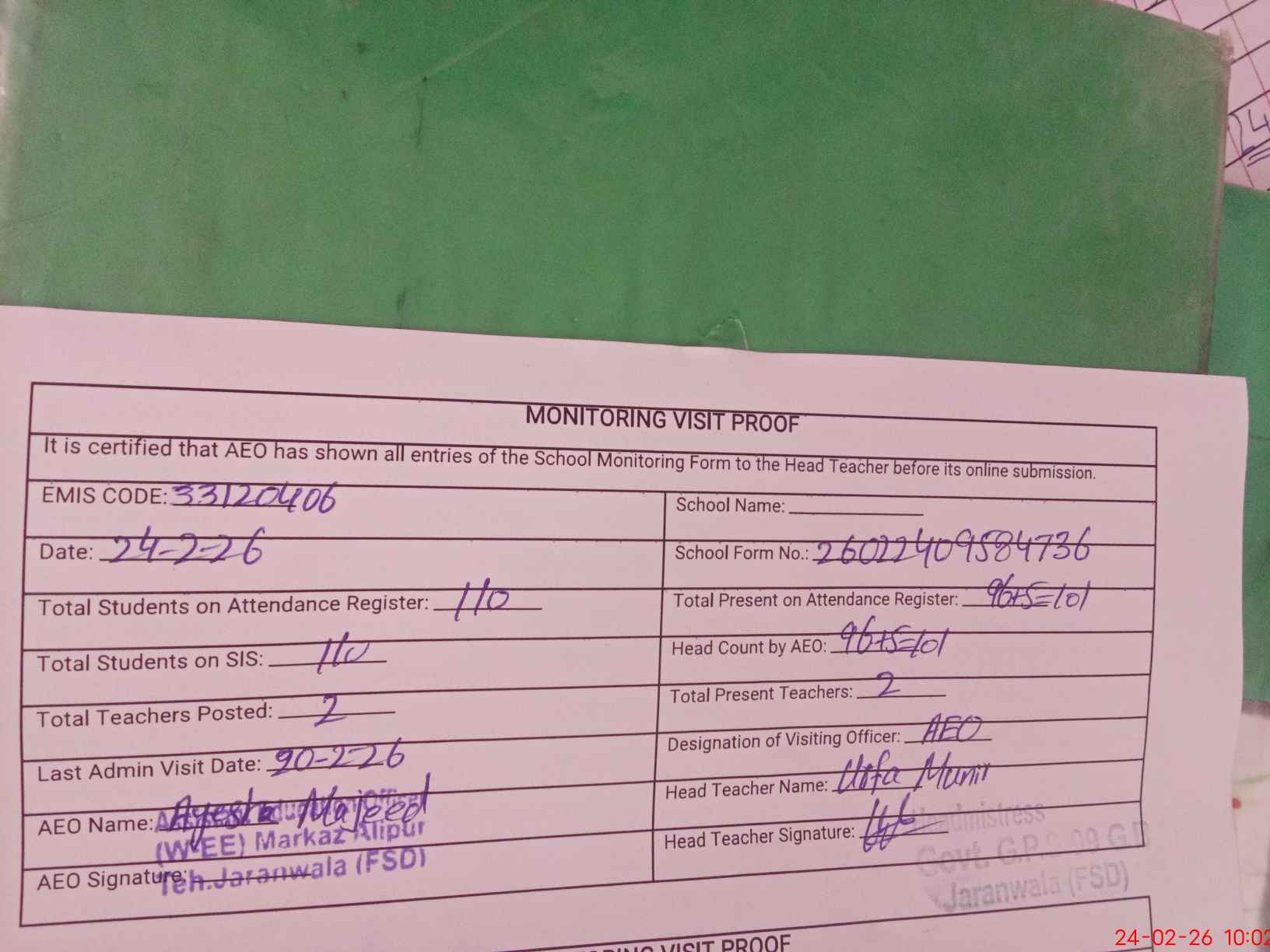 | District: FAISALABAD | Tehsil: JARANWALA | Markaz: ALI PUR BANGLA - FEMALE | Level: Primary | |