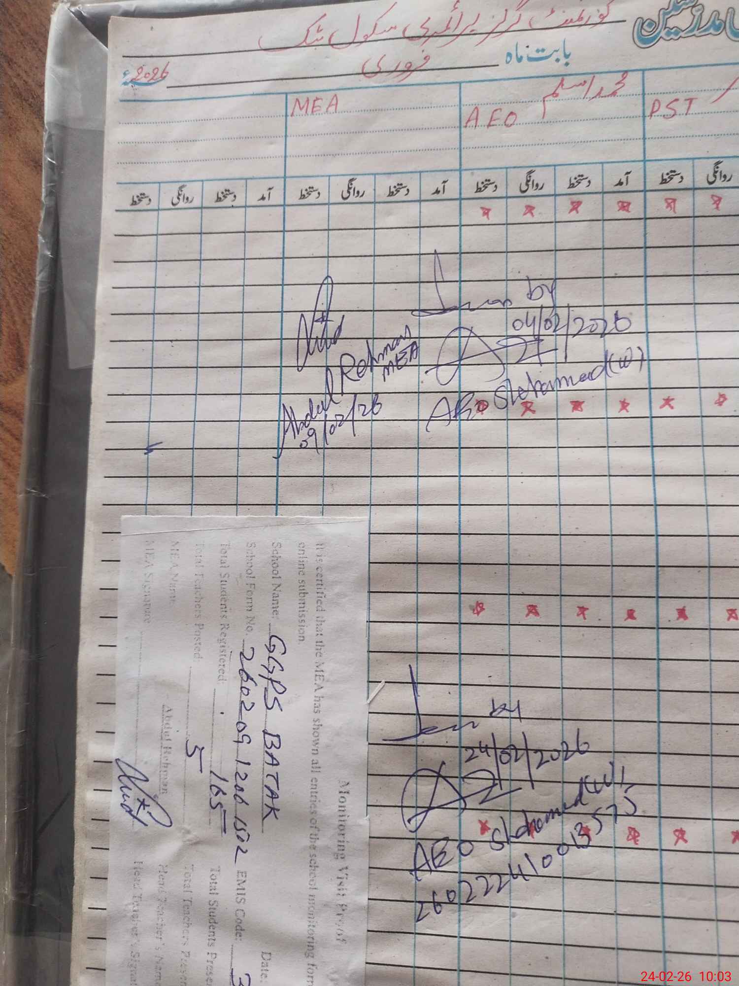 | Certified that this School was Inspected by the Undersigned MEA/DMO Today and the Information Stated Above is as Per Record. | |||||