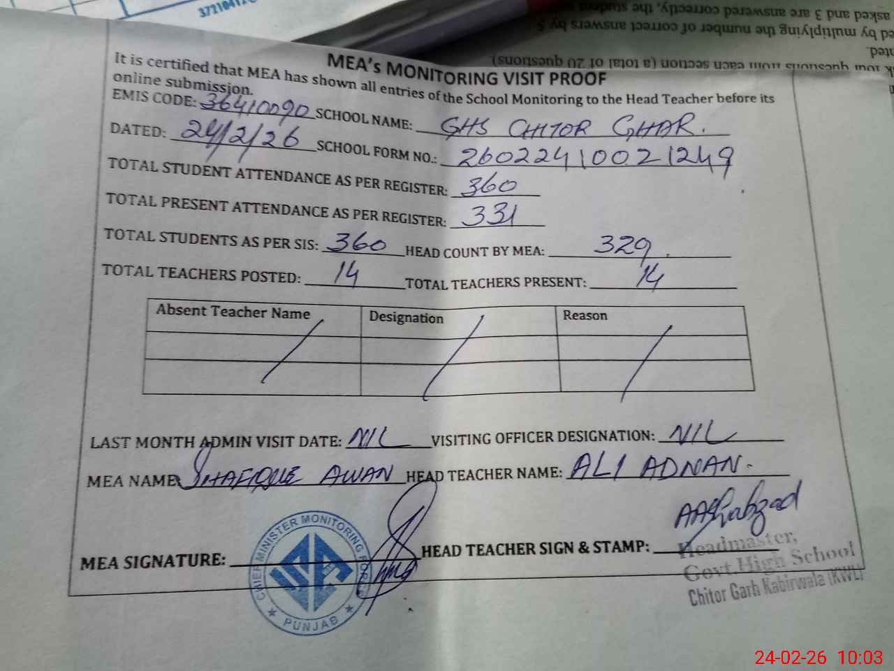 | EMIS Code: 36410090 | Name of School: GHS CHITOR GARH QADEEM, P/O CHAK HAIDER ABAD, NAWAN SHEHR | |||