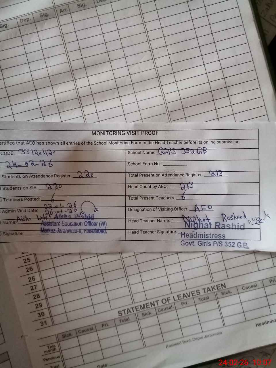 | Attendance Register | Head Teacher | MEA with School | Visit Proof |