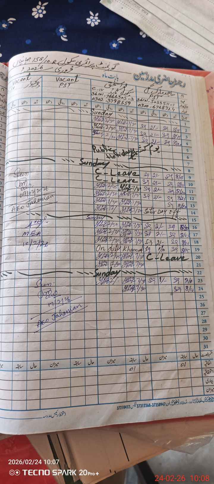 | Name: Mu**** Ir**** Designation: (School Headmaster's/Headmistress's) EST(G) Phone/Cell Number: 03**** |
