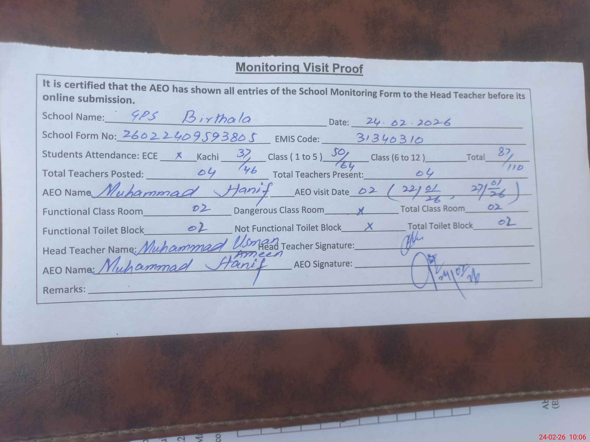 | Monitoring Date: 24-02-2026 | Start Time: 24-02-2026 09:33 AM | End Time: 24-02-2026 10:09 AM | Name of MEA: Mu**** Ha**** | |