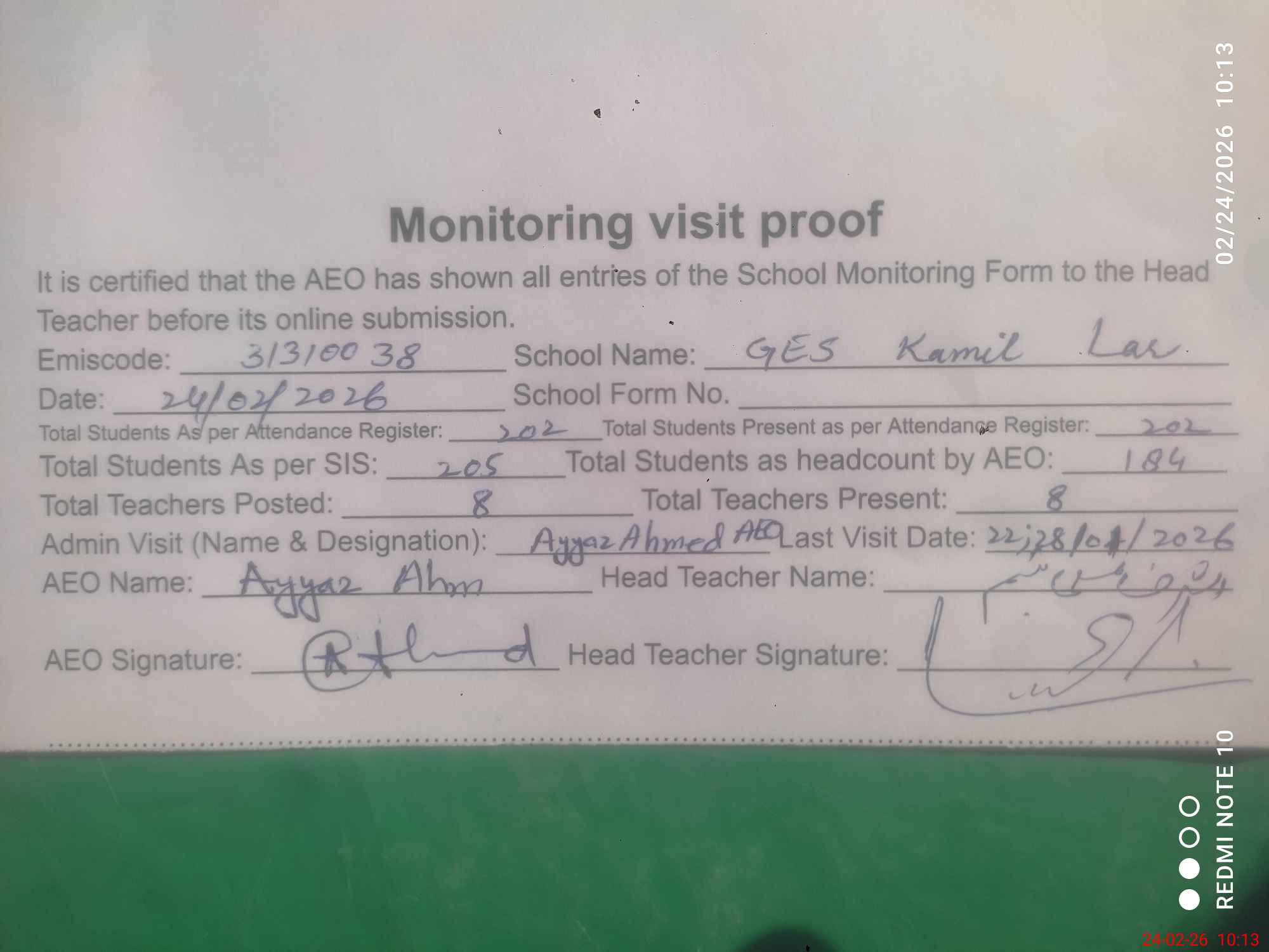 | Attendance Register | Head Teacher | MEA with School | Visit Proof |