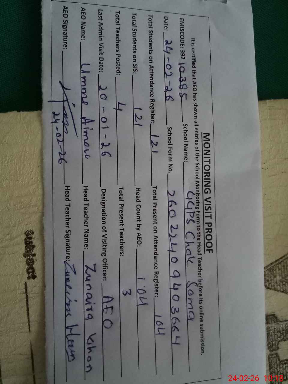 | Name: Zu**** Kh**** Designation: (School Headmaster's/Headmistress's) PST Phone/Cell Number: 03**** |