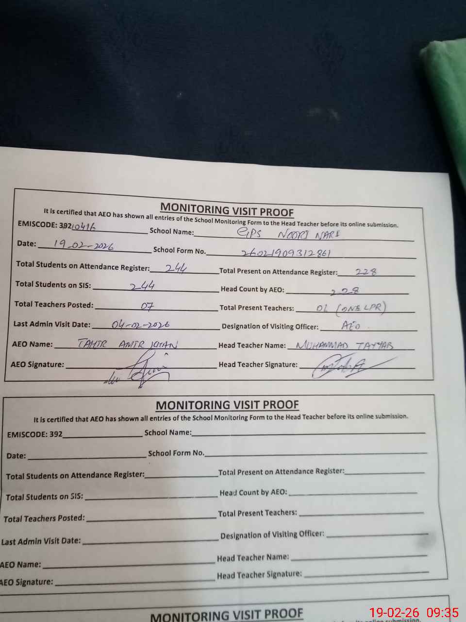 | Certified that this School was Inspected by the Undersigned MEA/DMO Today and the Information Stated Above is as Per Record. | |||||