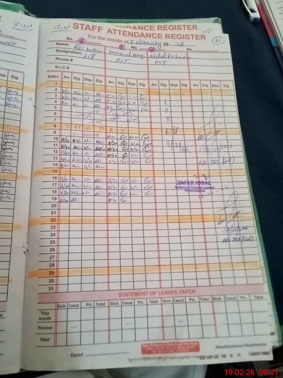 | CNIC | Full Name | Designation | R/C | Absence During Last Calender Month |