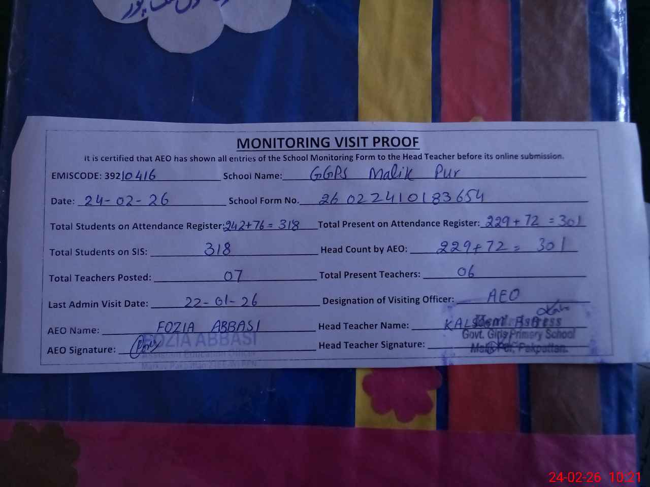 | EMIS Code: 39210416 | Name of School: GGPS MALIK PUR | |||