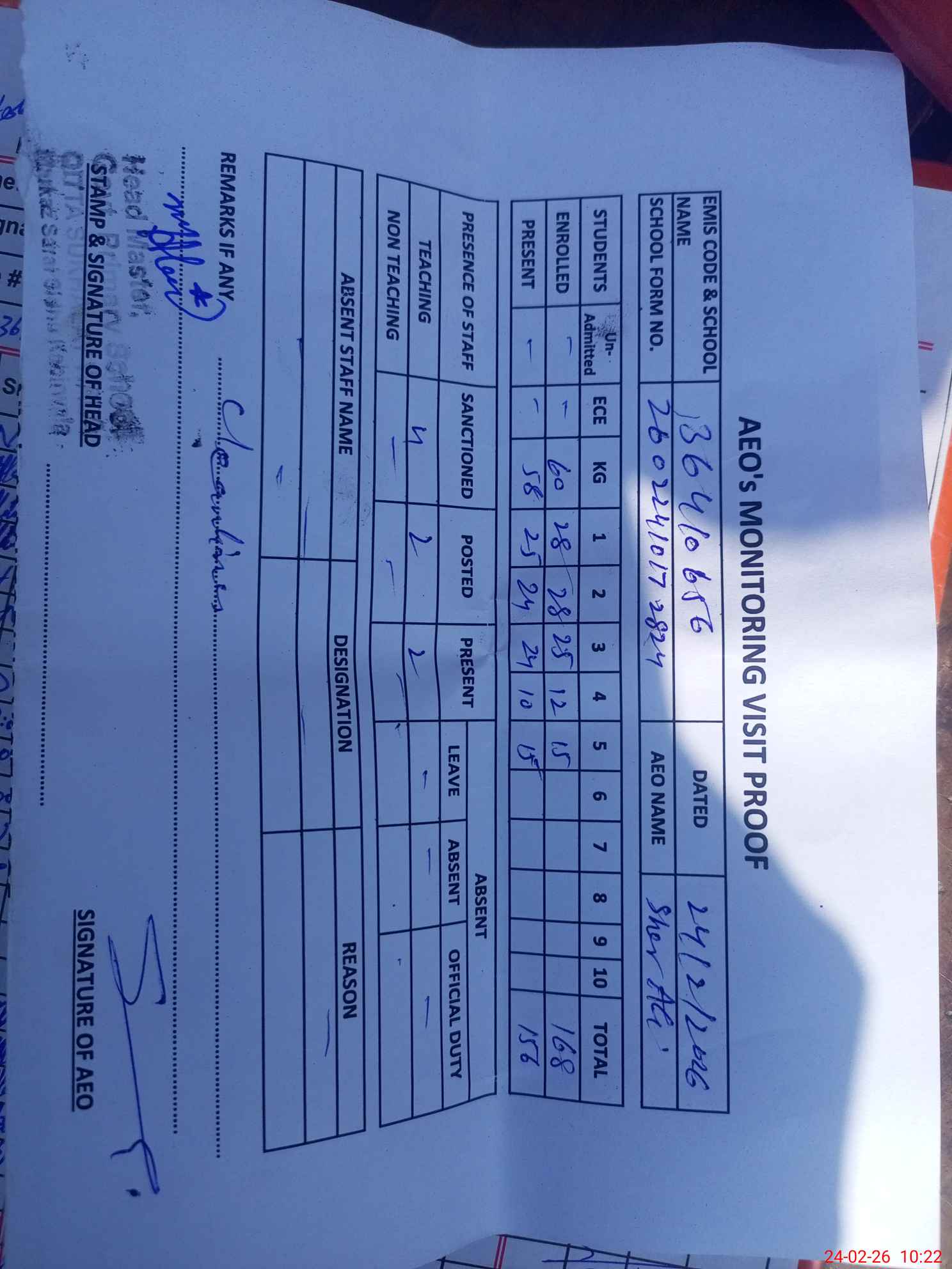 | Attendance Register | Head Teacher | MEA with School | Visit Proof |