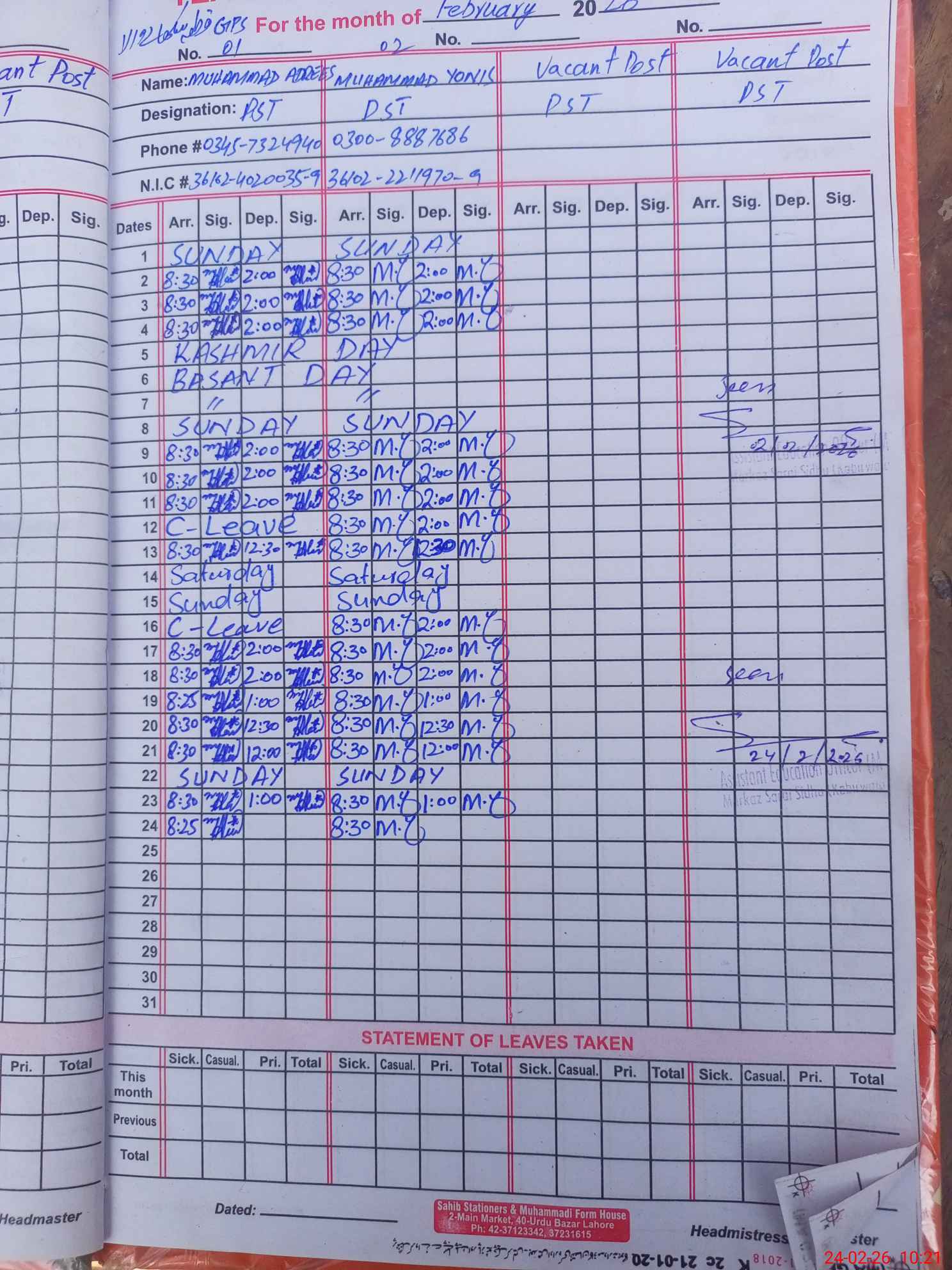 | CNIC | Full Name | Designation | R/C | Absence During Last Calender Month |