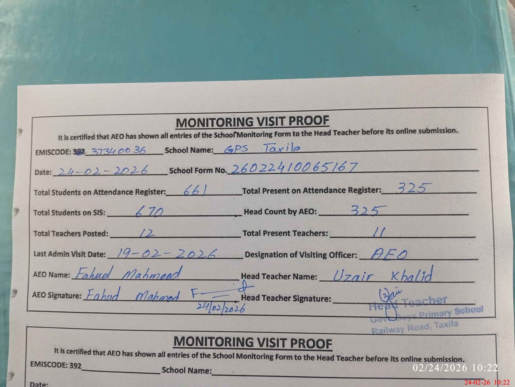 | EMIS Code: 37340036 | Name of School: GPS TAXILA | |||