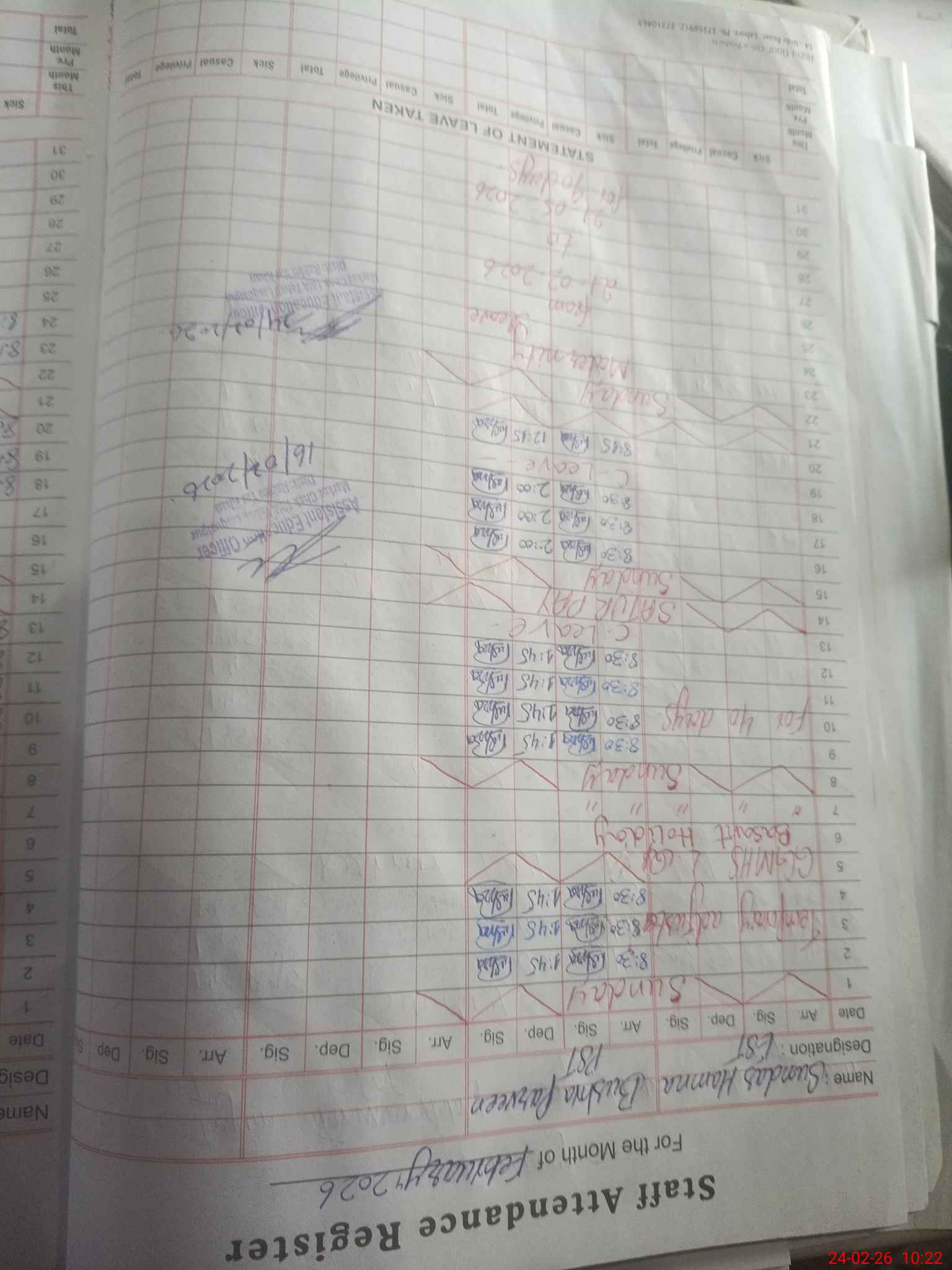 | Leave | Duty | Absent | Maternity | Medical | Ex- Pak |
