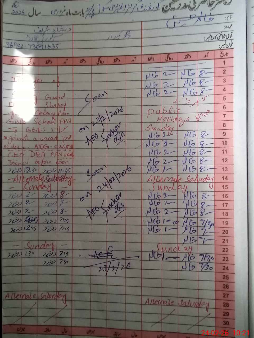| CNIC | Full Name | Designation | R/C | Absence During Last Calender Month |
