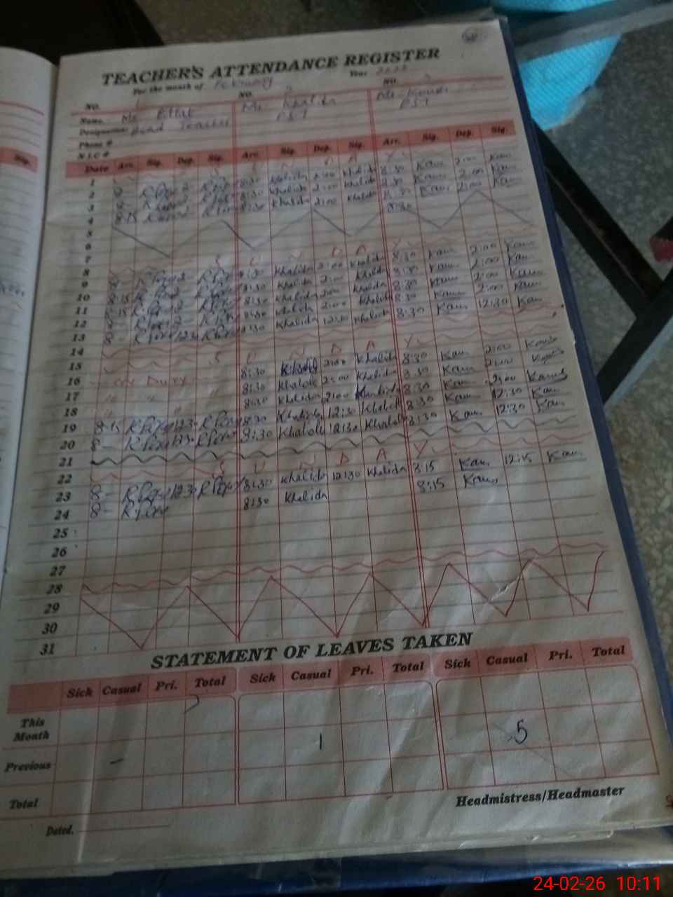 | Leave | Duty | Absent | Maternity | Medical | Ex- Pak |