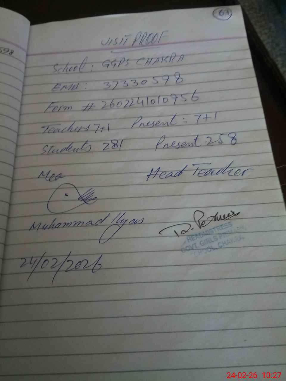 | Attendance Register | Head Teacher | MEA with School | Visit Proof |
