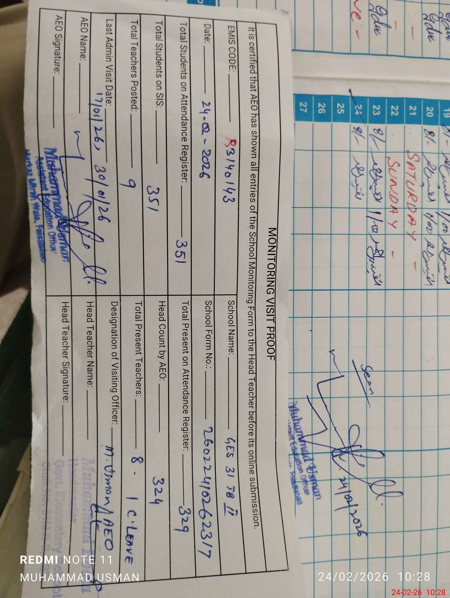 | Certified that this School was Inspected by the Undersigned MEA/DMO Today and the Information Stated Above is as Per Record. | |||||