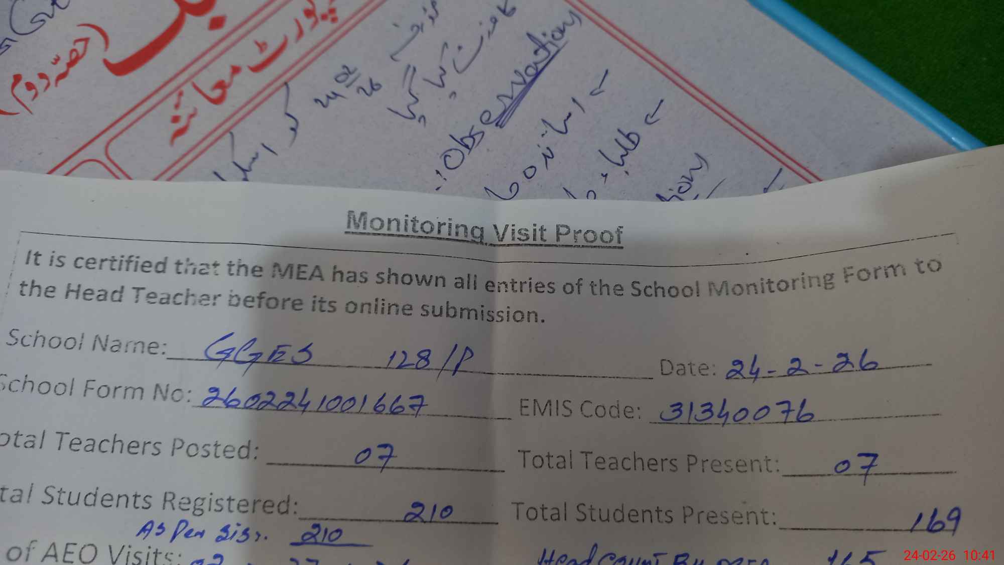 | Certified that this School was Inspected by the Undersigned MEA/DMO Today and the Information Stated Above is as Per Record. | |||||