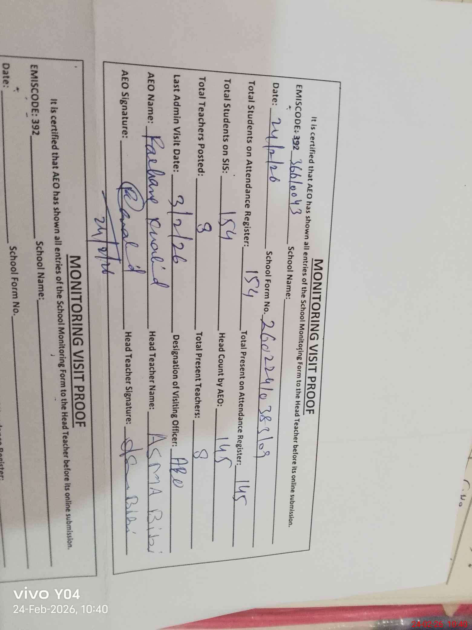 | Certified that this School was Inspected by the Undersigned MEA/DMO Today and the Information Stated Above is as Per Record. | |||||