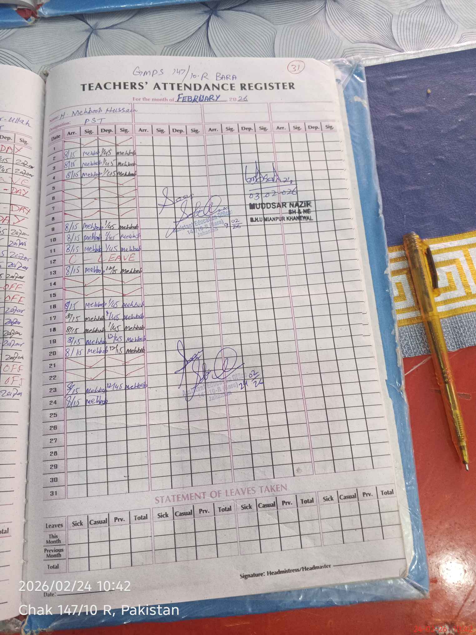 | Attendance Register | Head Teacher | MEA with School | Visit Proof |