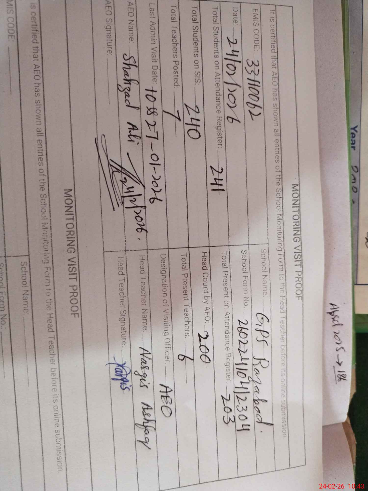 | Certified that this School was Inspected by the Undersigned MEA/DMO Today and the Information Stated Above is as Per Record. | |||||