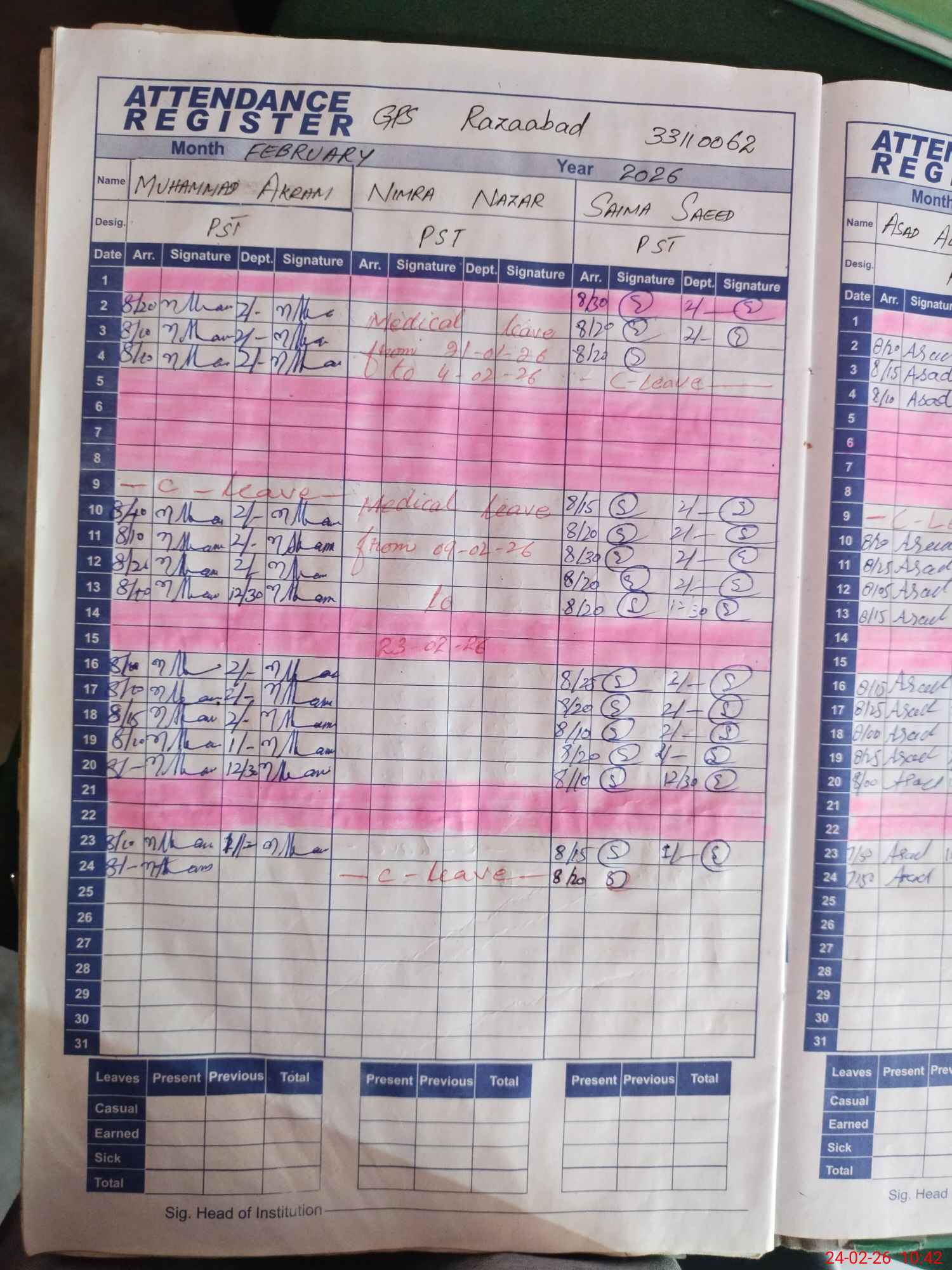 | Leave | Duty | Absent | Maternity | Medical | Ex- Pak |