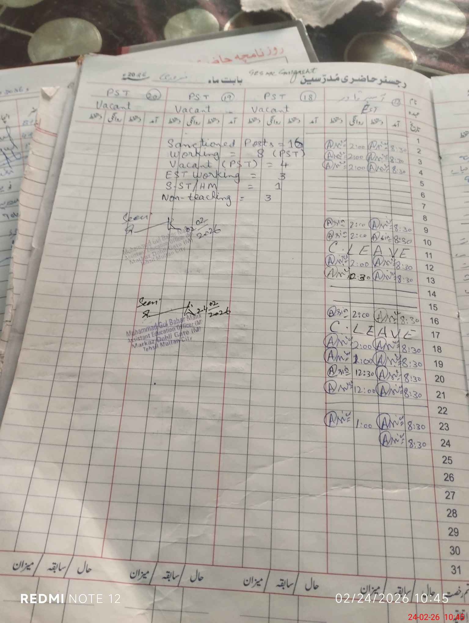 | CNIC | Full Name | Designation | R/C | Absence During Last Calender Month |