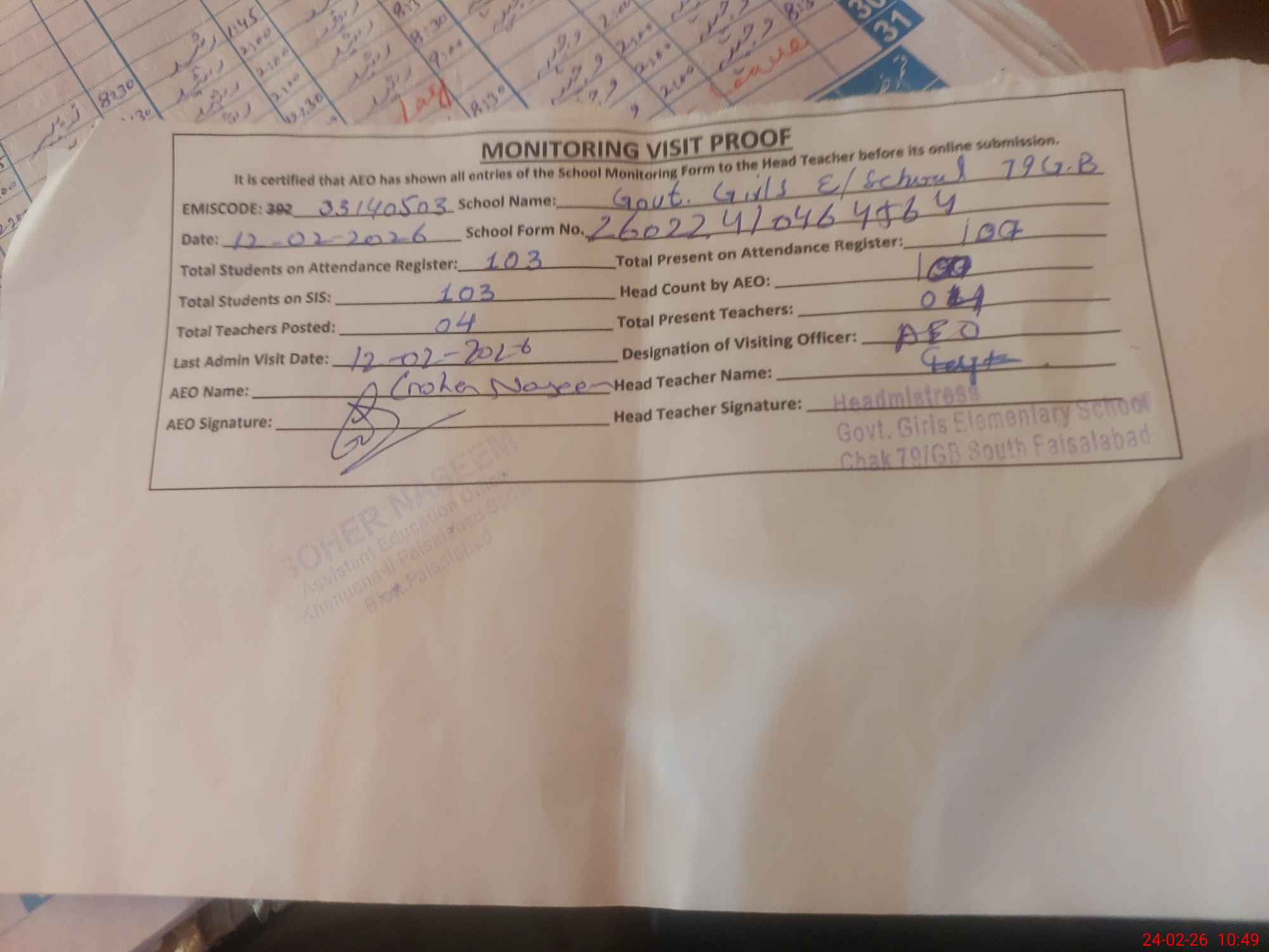 | Attendance Register | Head Teacher | MEA with School | Visit Proof |