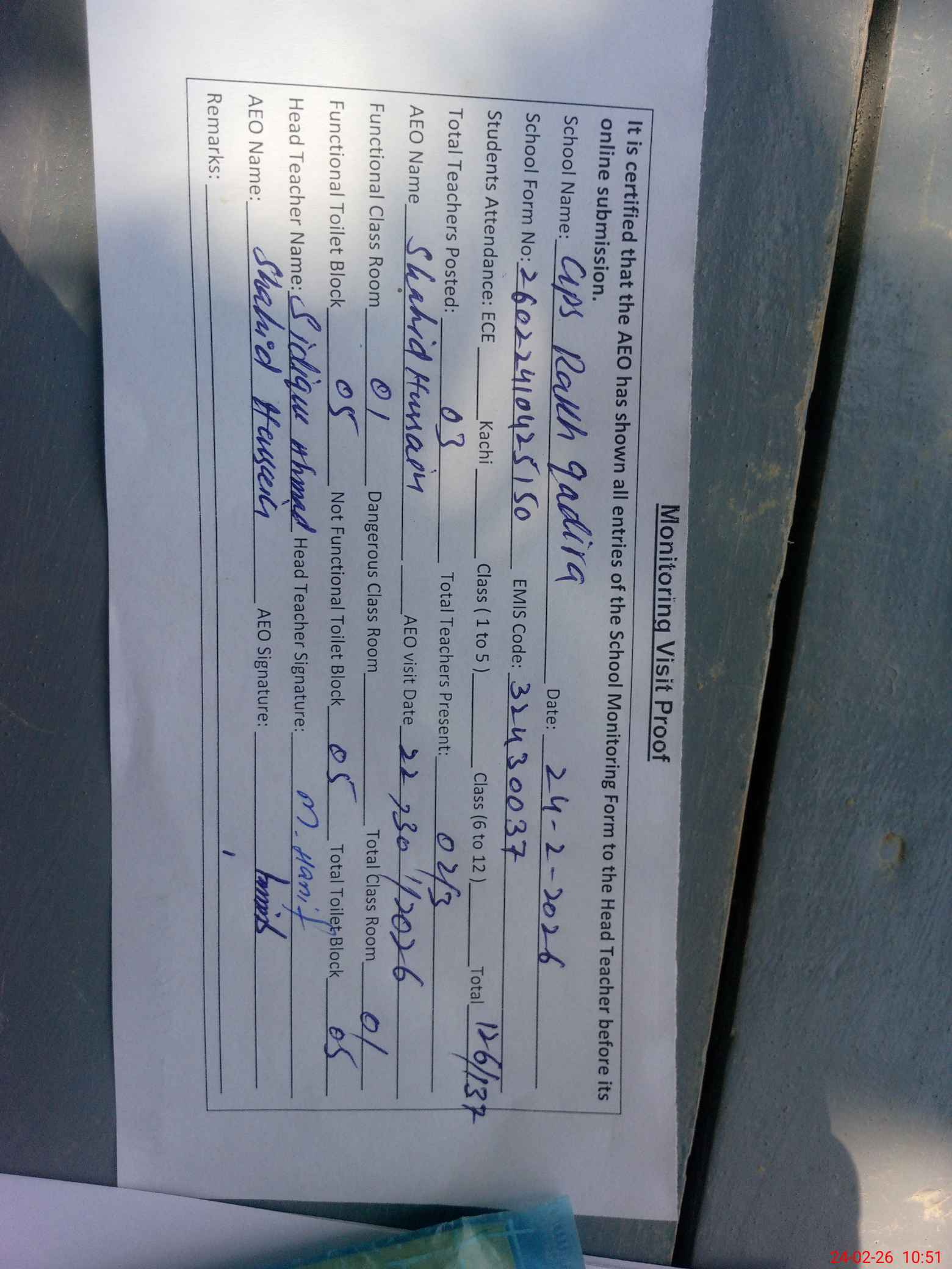 | EMIS Code: 32430037 | Name of School: GPS RAKH QADIRA | |||