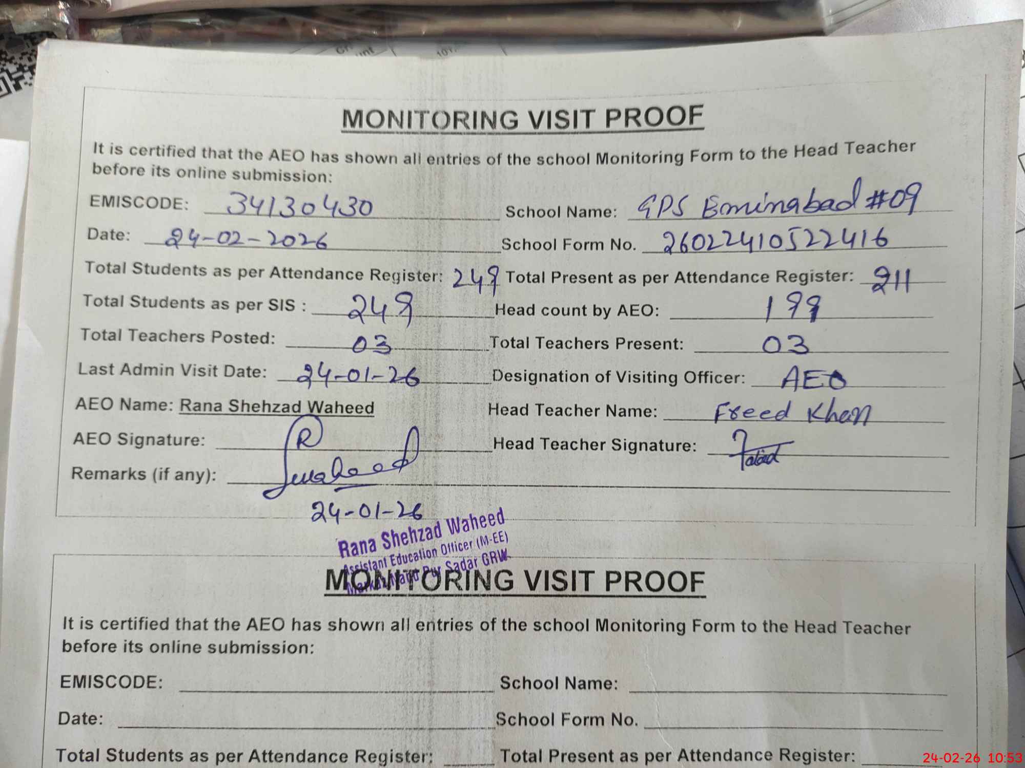 | Certified that this School was Inspected by the Undersigned MEA/DMO Today and the Information Stated Above is as Per Record. | |||||