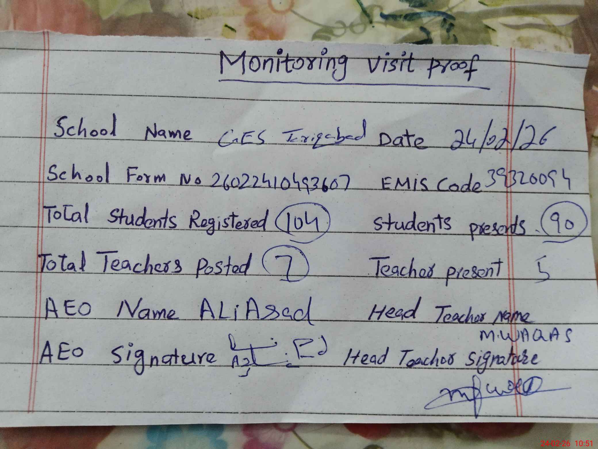 | Attendance Register | Head Teacher | MEA with School | Visit Proof |