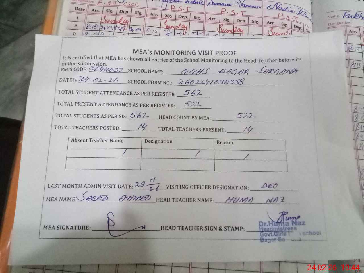 | Monitoring Date: 24-02-2026 | Start Time: 24-02-2026 09:53 AM | End Time: 24-02-2026 10:57 AM | Name of MEA: Sa**** Ah**** | |