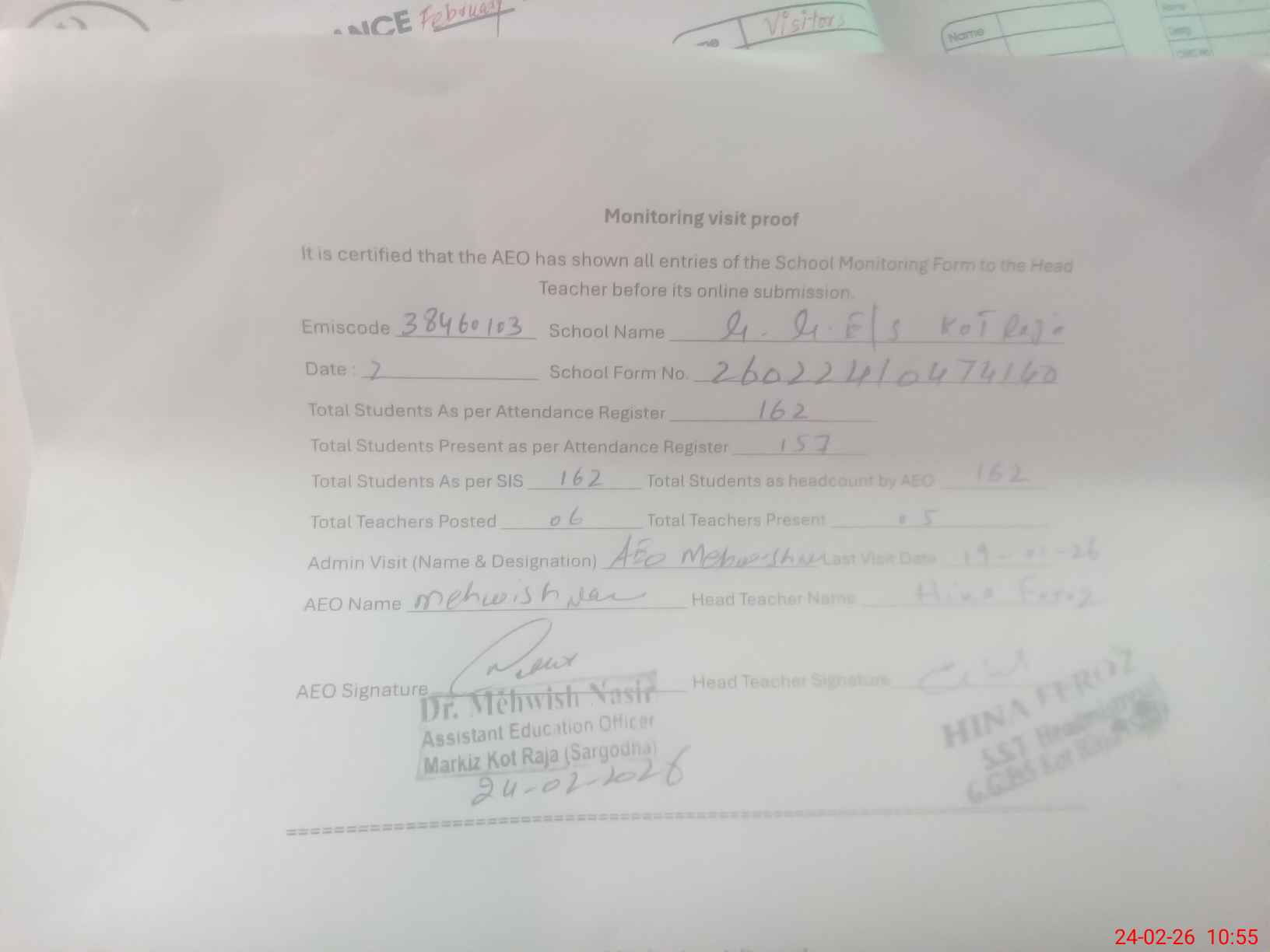 | Attendance Register | Head Teacher | MEA with School | Visit Proof |