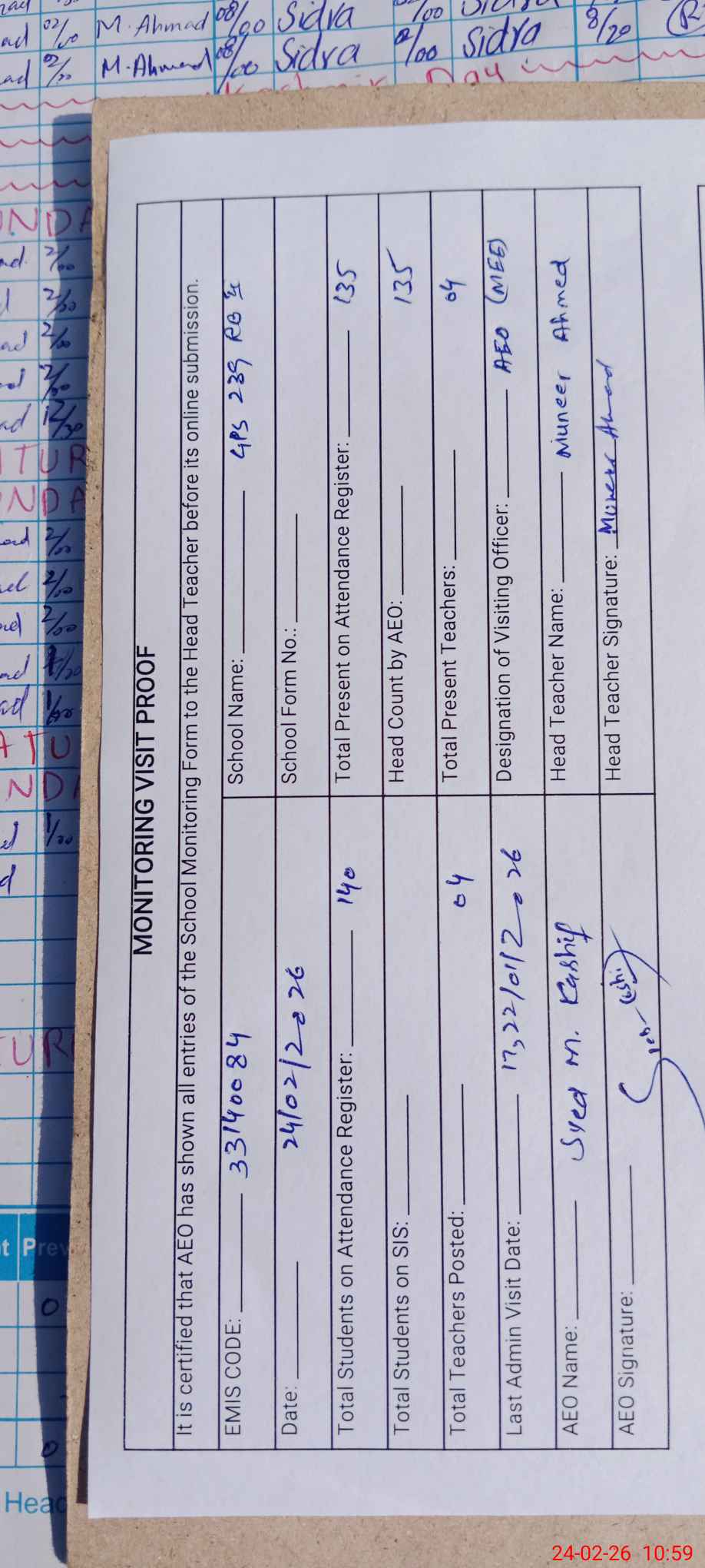| Monitoring Date: 24-02-2026 | Start Time: 24-02-2026 10:31 AM | End Time: 24-02-2026 10:59 AM | Name of MEA: Sy**** M.Ka**** | |