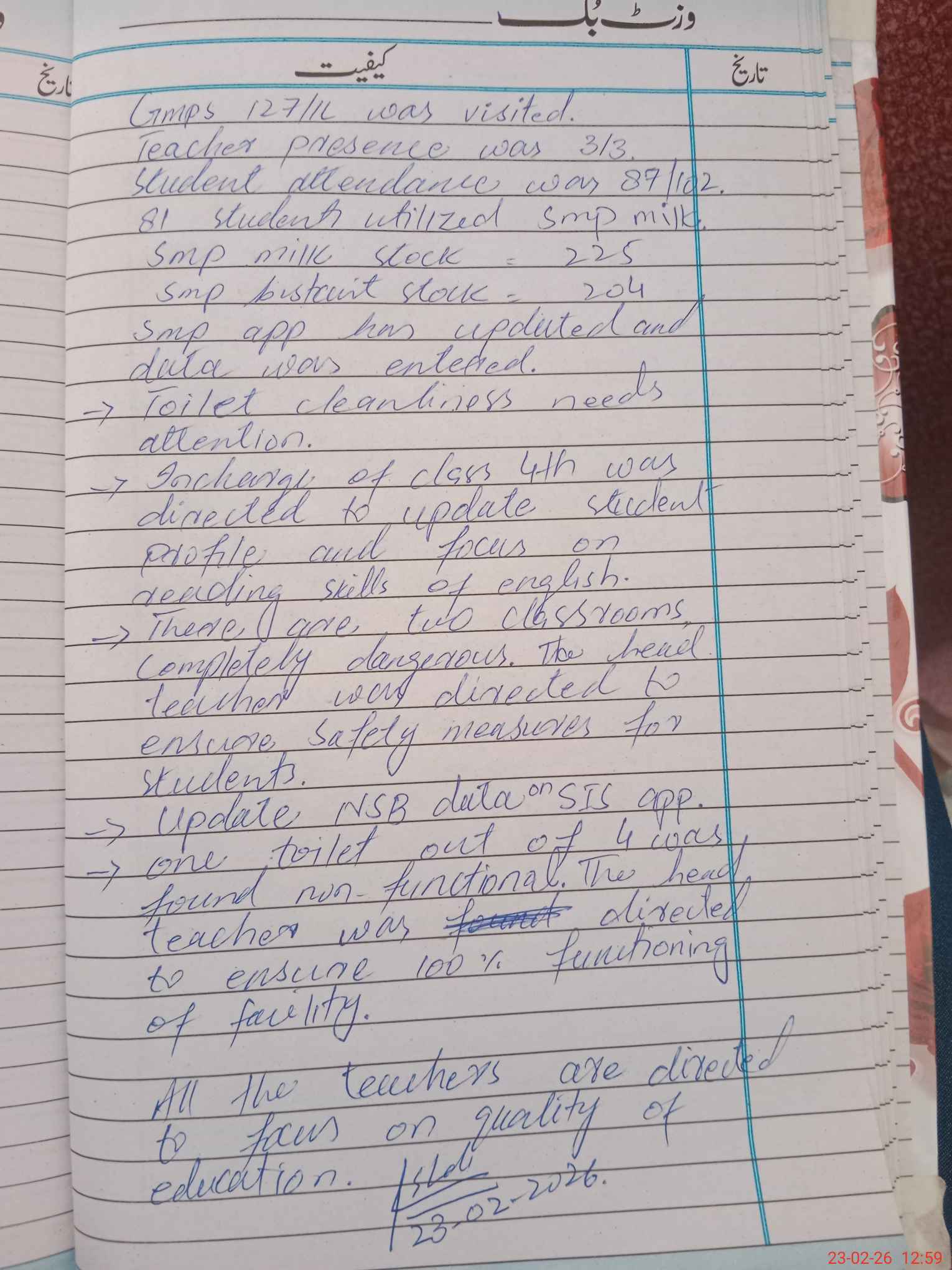 | Attendance Register | Head Teacher | MEA with School | Visit Proof |