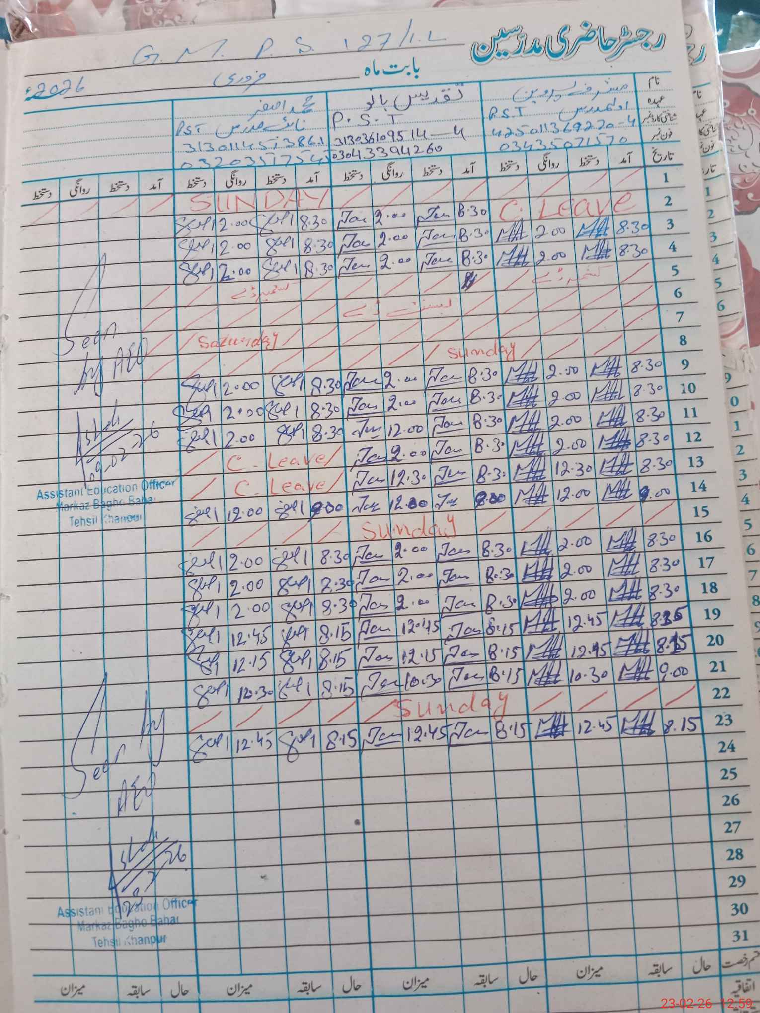 | Name: Mu**** Pa**** Designation: (School Headmaster's/Headmistress's) PST Phone/Cell Number: 03**** |