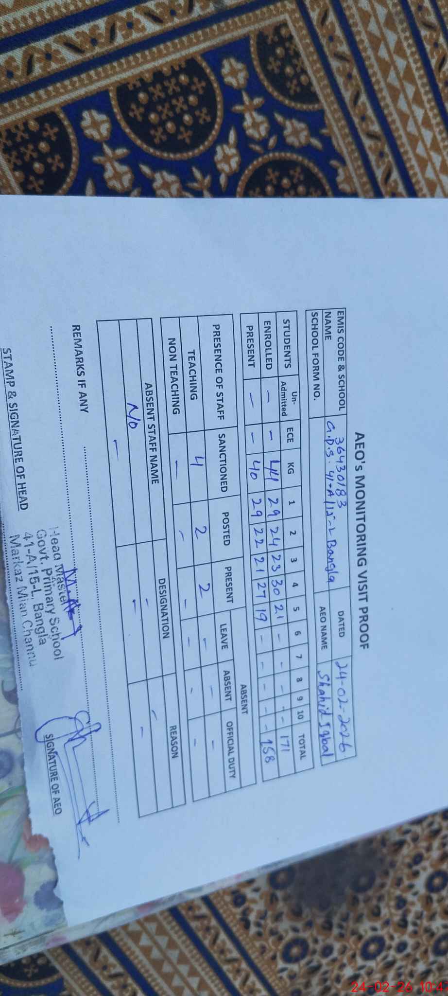 | EMIS Code: 36430183 | Name of School: GPS 41-A/15-L, BANGLA, MIAN CHANNU | |||