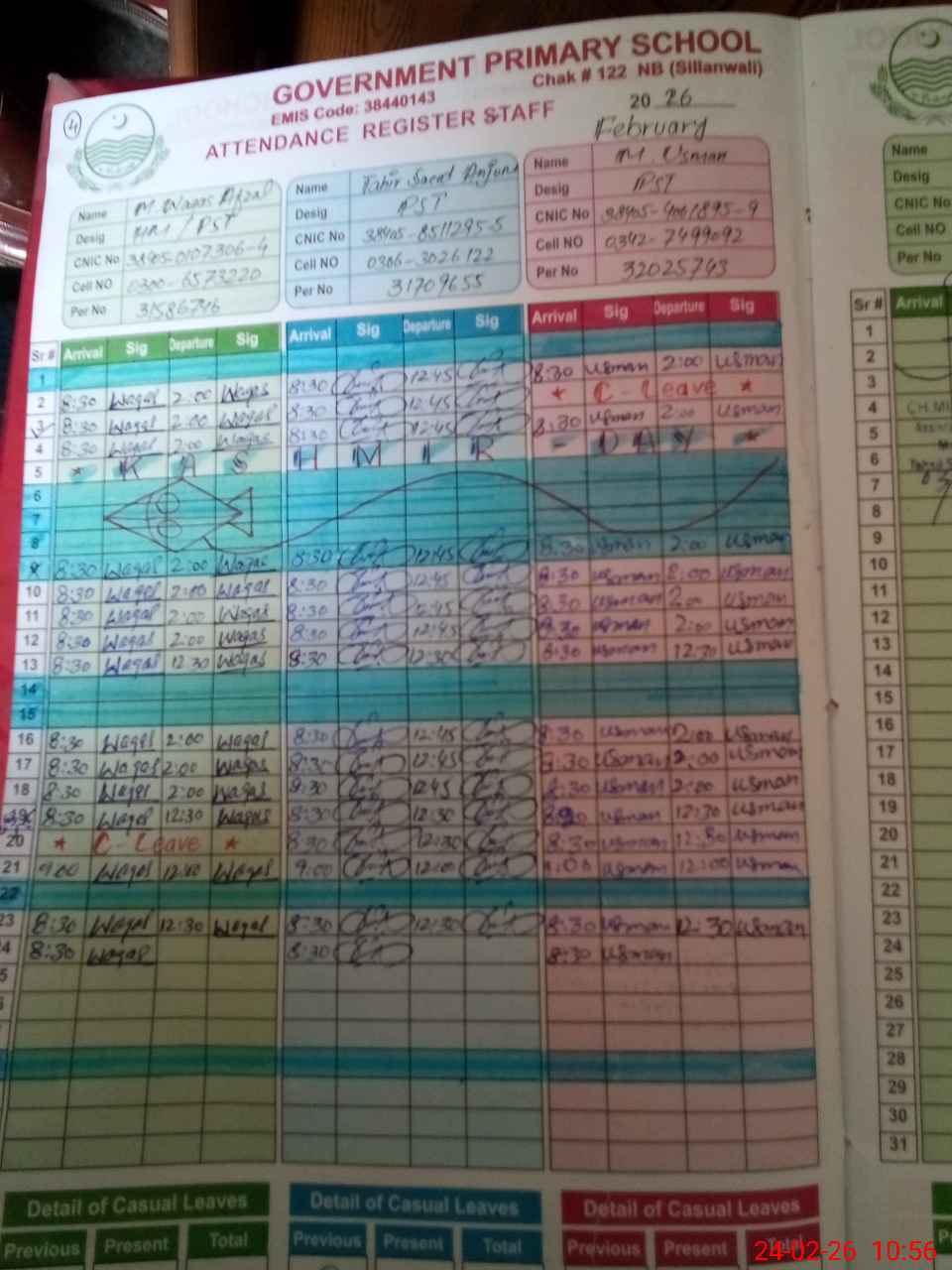 | CNIC | Full Name | Designation | R/C | Absence during last cal. month |