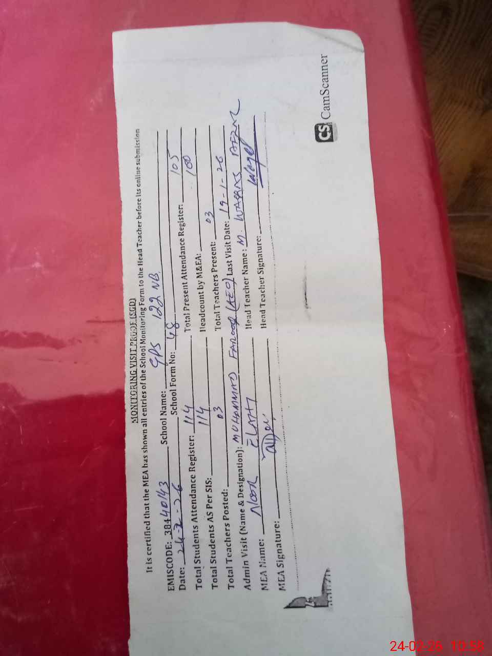 | Attendance Register | Head Teacher | MEA with School | Visit Proof |