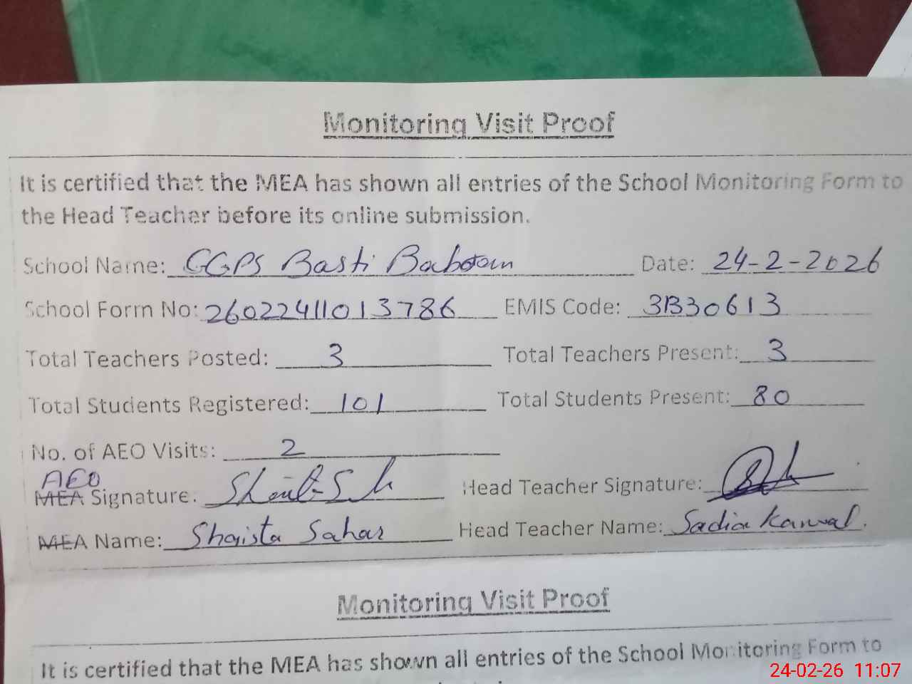 | Attendance Register | Head Teacher | MEA with School | Visit Proof |