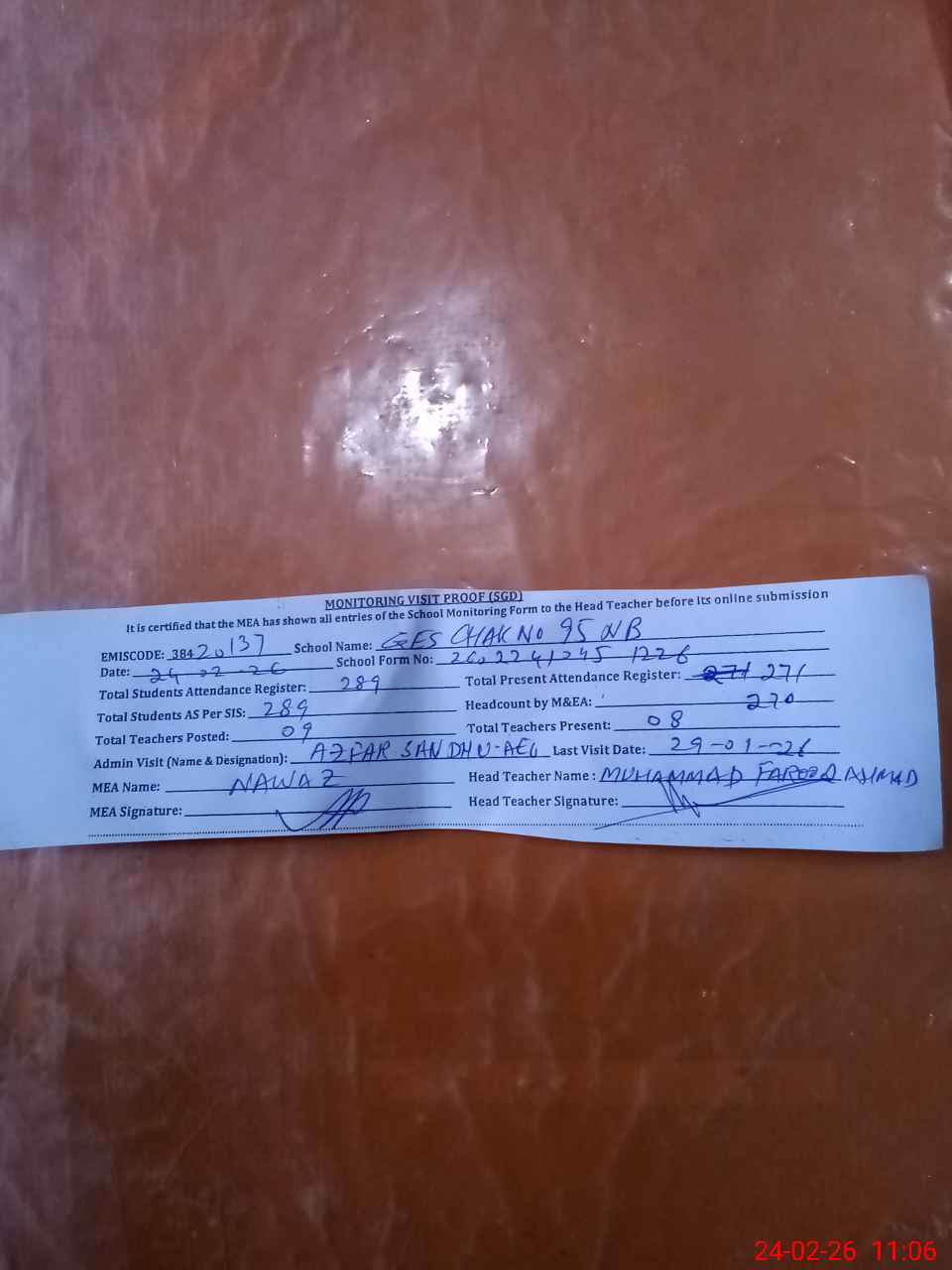 | Attendance Register | Head Teacher | MEA with School | Visit Proof |