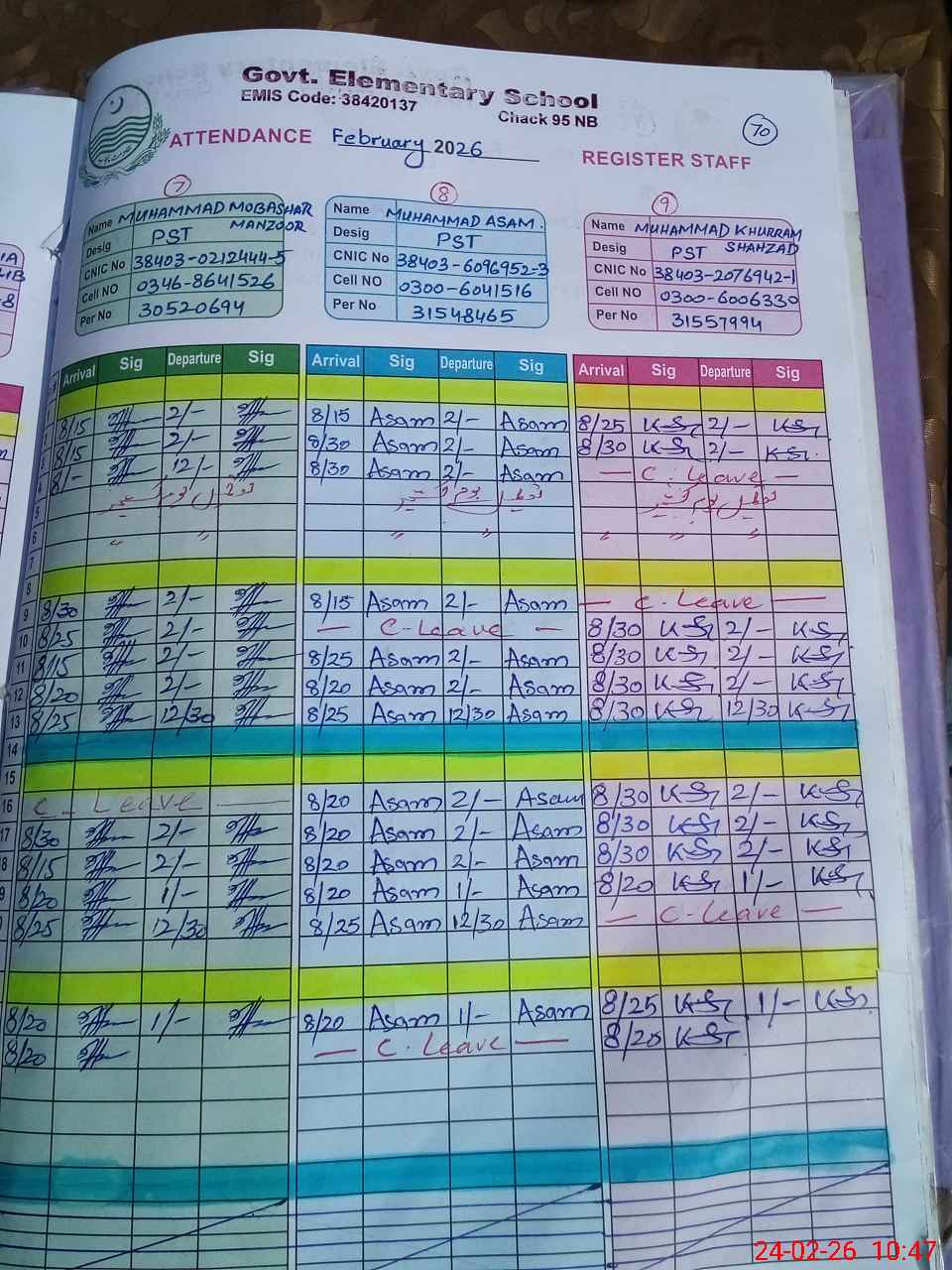 | CNIC | Full Name | Designation | R/C | Absence during last cal. month |