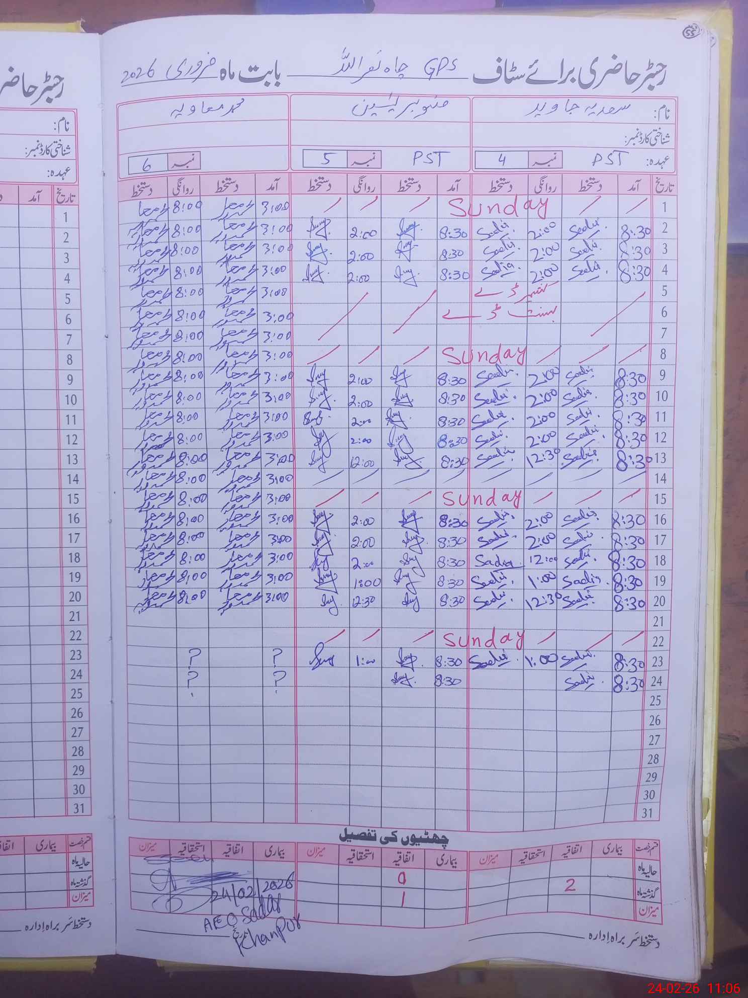 | CNIC | Full Name | Designation | R/C | Absence During Last Calender Month |