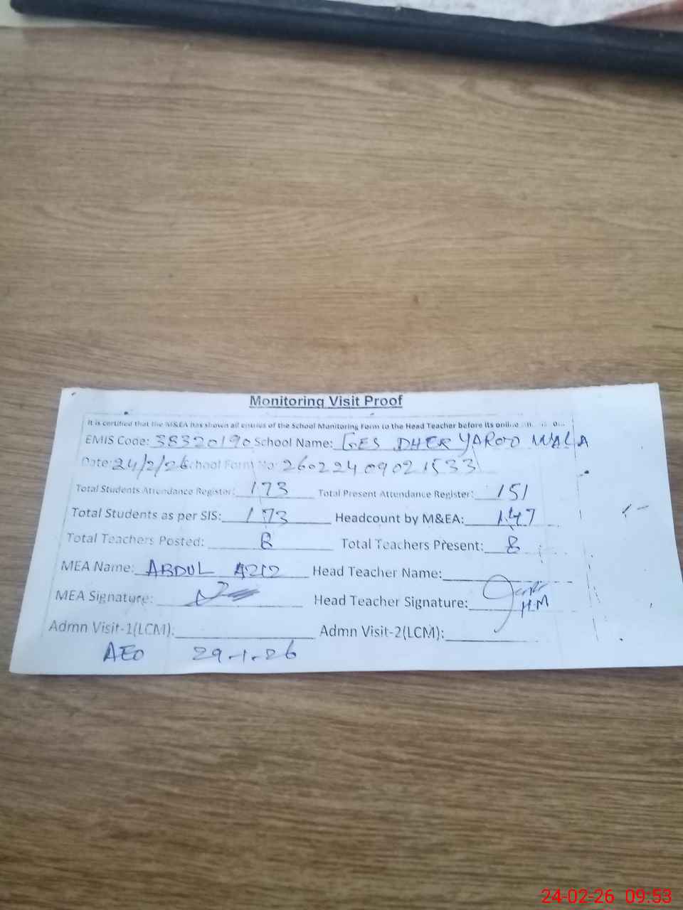 | EMIS Code: 38320190 | Name of School: GES DHER YAROO WALA | |||