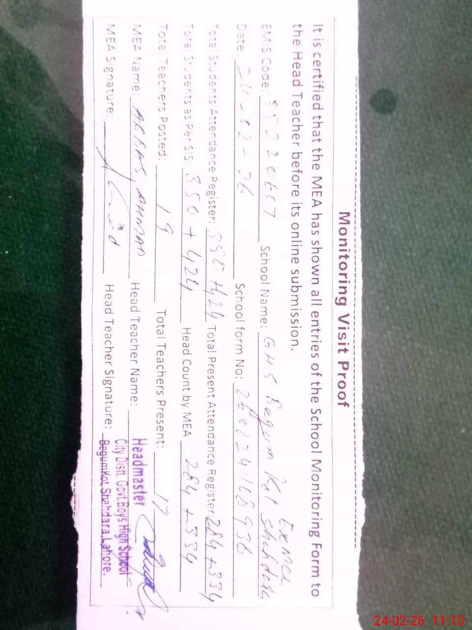 | EMIS Code: 35220607 | Name of School: GHS BEGUM KOT SHAHDARA (EX-MCL) | |||