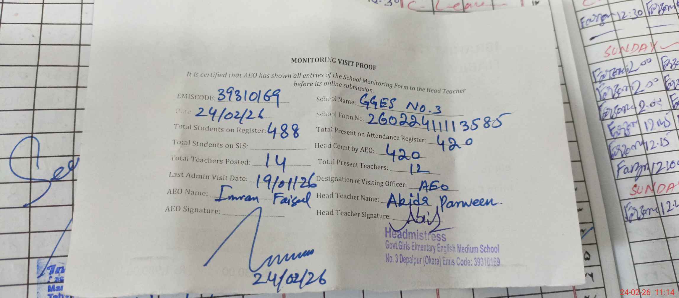 | Attendance Register | Head Teacher | MEA with School | Visit Proof |