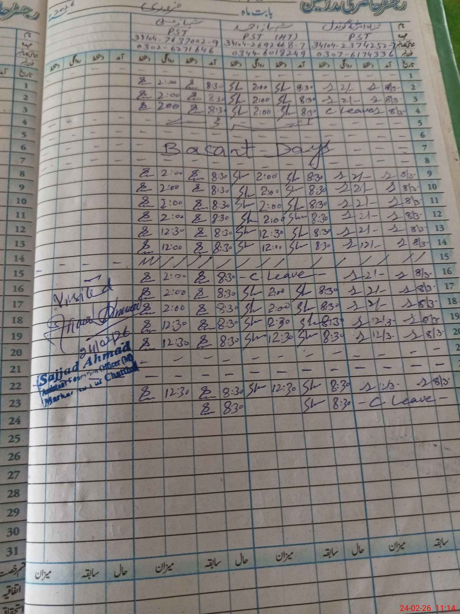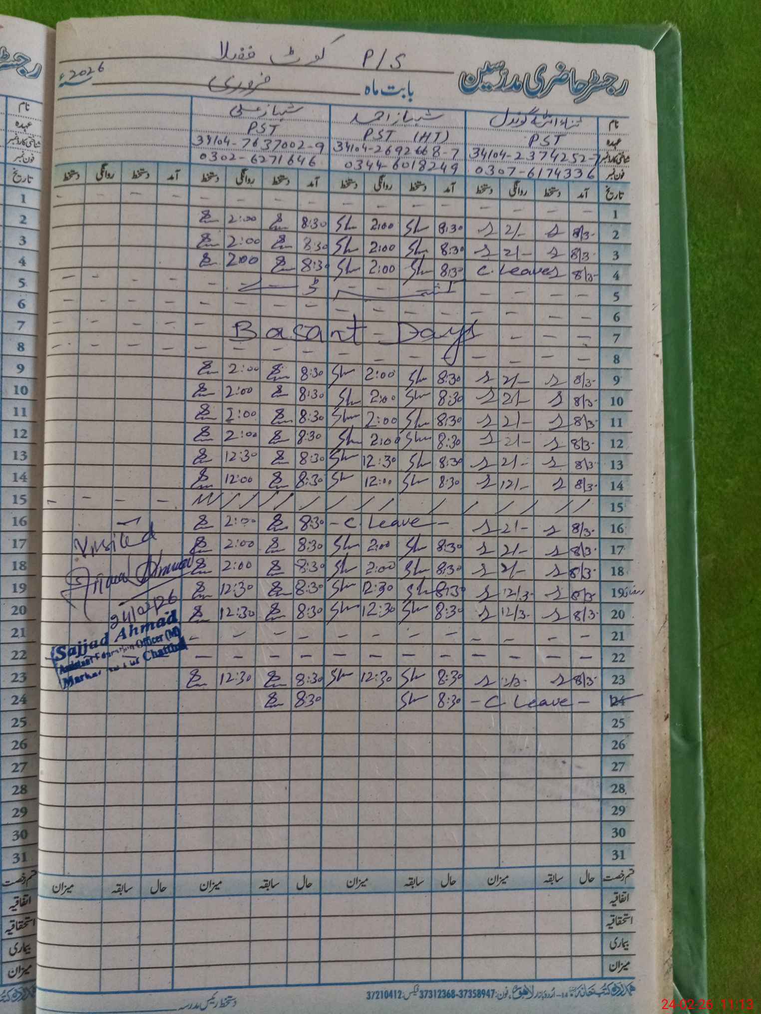 | Name: Sh**** Ah**** Designation: (School Headmaster's/Headmistress's) PST Phone/Cell Number: 03**** |