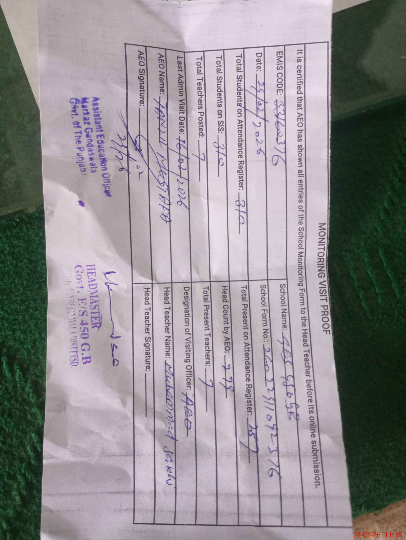 | Certified that this School was Inspected by the Undersigned MEA/DMO Today and the Information Stated Above is as Per Record. | |||||