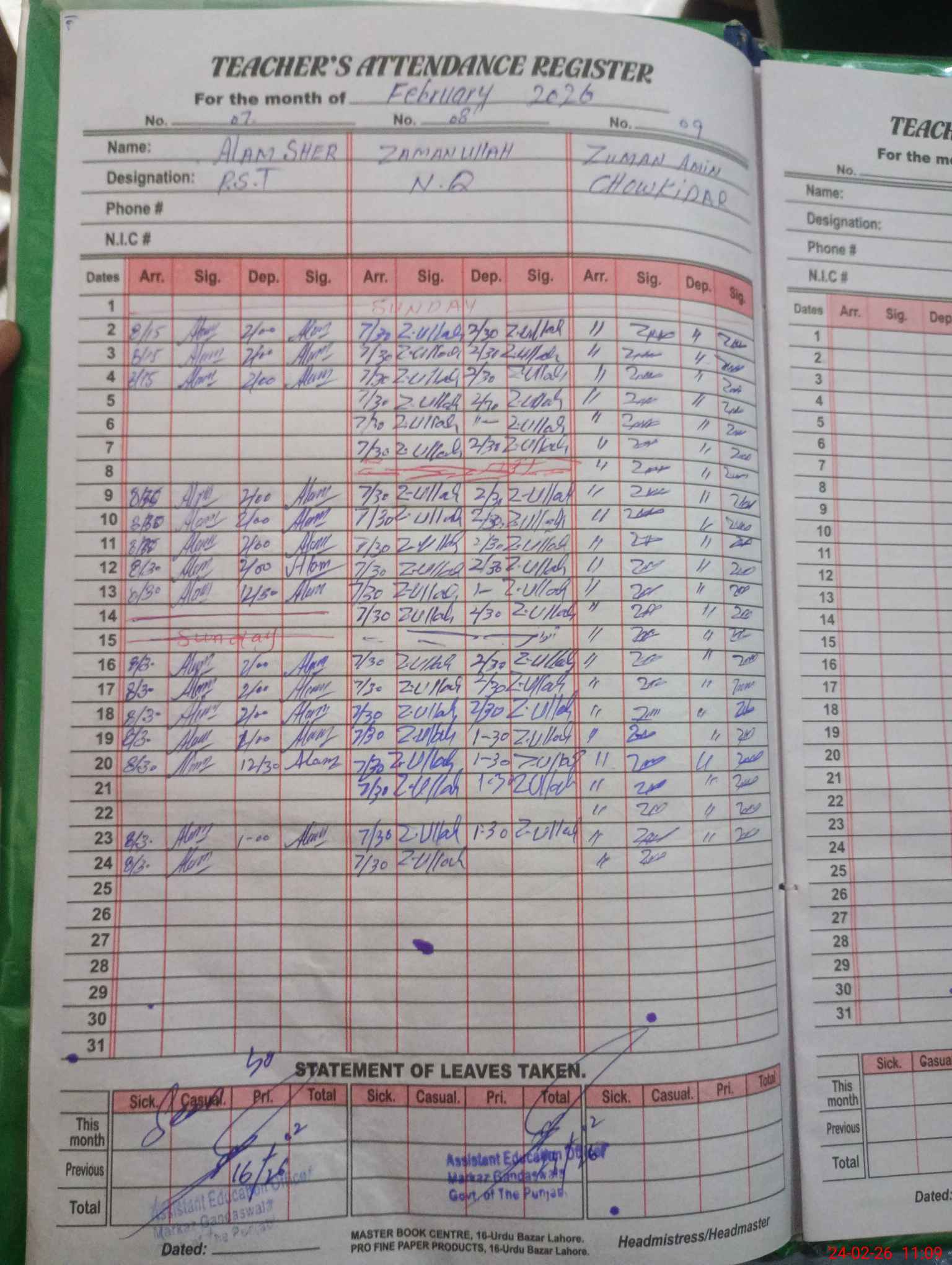 | CNIC | Full Name | Designation | R/C | Absence During Last Calender Month |