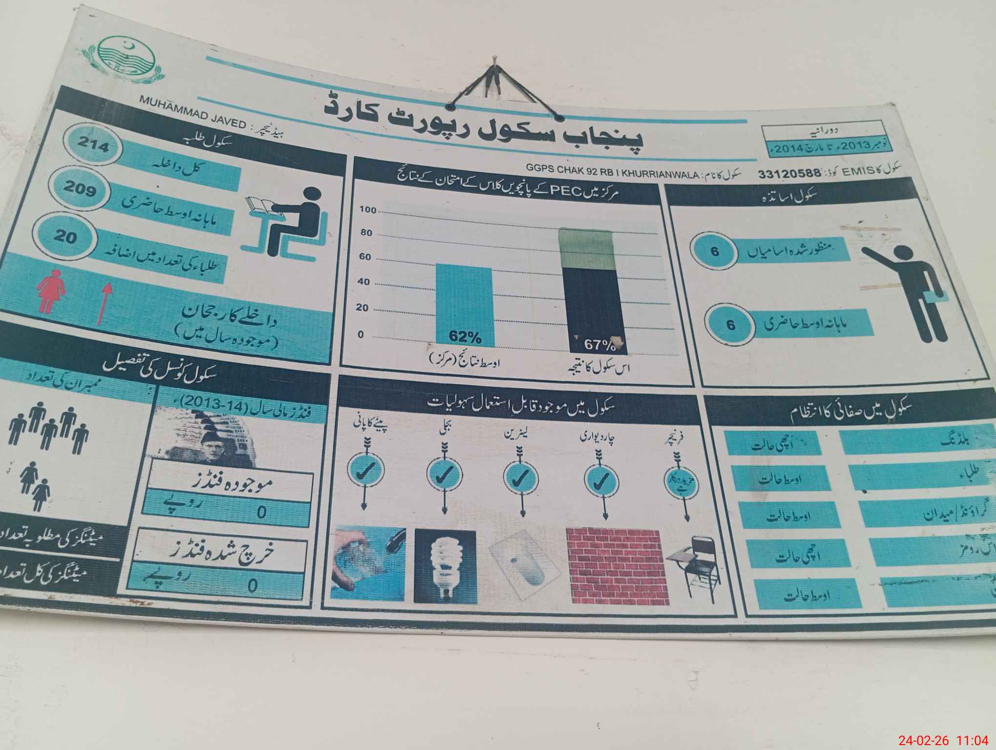 | EMIS Code: 33120588 | Name of School: GGPS CHAK 92 RB I KHURRIANWALA | |||